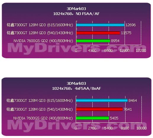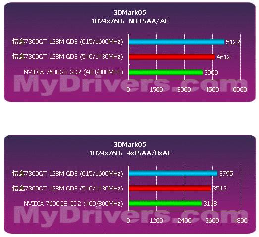 铭鑫7300GT 128M GD3显卡的默认频率达到了540/1430MHz,在默认频率下的性能已经超越标准版7600GS。在超频测试中,铭鑫7300GT 128M GD3显卡可以稳定运行在615/1600MHz的频率下,性能更是得到了巨大的提升,现在这款显卡的价格为549元,相比一些600多元的低频7600GS来说,铭鑫7300GT 128M GD3具有很强的性能优势,近期装机或升级用户可以关注一下。