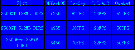 从测试来看,就算搭配了512MB DDR2显存, 8500GT依旧不是128MB DDR3 8600GT的对手。本来8500GT本来流处理器(SP)数量就只有8600GT的一半,再加上低运行频率的DDR2显存的拖累,性能比不过128MB的8600GT就不足为奇了。瘦死的骆驼比马大,两条腿又怎么可能跑得过四条腿?而且在面对2600PRO这样使用DDR3 256MB高频的强劲对手,同样能够完美胜出,当然,也许有人会说2600PRO具有高清方面的优势,但是关于高清,请看我们的详细评测:美好的理想、残酷的现实——HDTV入门与显卡解码现状测试分析,而游戏呢?请见:谁是英豪?——33款游戏评选最强平民游戏显卡。当然,128MB显存似乎成了视界风追风版 8600GTU-512D3TC挥之不去的阴影,为了解除您的顾虑,铭鑫自有法宝应对——