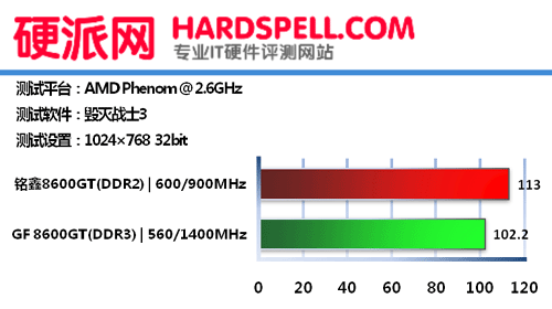从整个评测的数据来看,铭鑫视界风无双版8600GTU在性能上超越了GDDR3显存的公版GeForce 8600GT,要知道这款产品采用的是DDR2的显存颗粒,虽然在频率上相比公版产品吃亏,但是在铭鑫的设计工程师的精心调试下,无双版8600GTU通过更好的核心频率以及Shader频率在性能上占据上风,同时由于DDR2显存的成本优势,其价格比公版产品更低、购买更实惠。