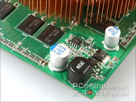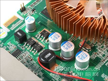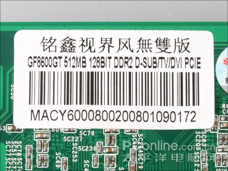 供电方面,铭鑫视界风无双版8600GTU-512D2使用了分离式供电架构设计,核心、显存独立供电,全封闭式电感搭配高品质电解电容,并且每相回路还提供2颗MOS管,保证为显卡核心以及显存提供纯净稳定的电流支持,而根据厂商透露,铭鑫旗下的产品亦即将全面转换至全固态电容用料的设计。从照片中我们可以看到,低通滤波设计完整, 2D色彩输出的还原程度和色彩表现能力有一定的保证,这对有设计应用及要求的用户是非常重要的。