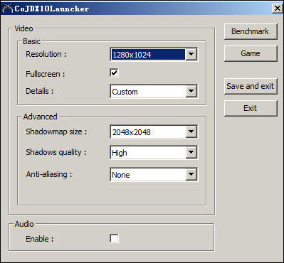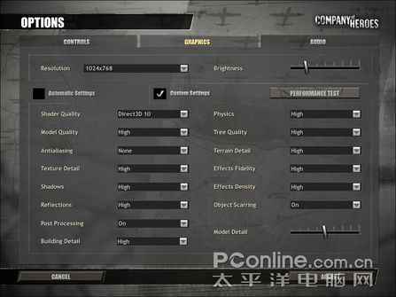 上图是关于英雄连《Company Of Heroes》的测试画质设定:Shadow Quality设置为DirecetX 10模式、所有特效均设置为高级,测试分辨率则采用1280 x 1024、1920×1200。
