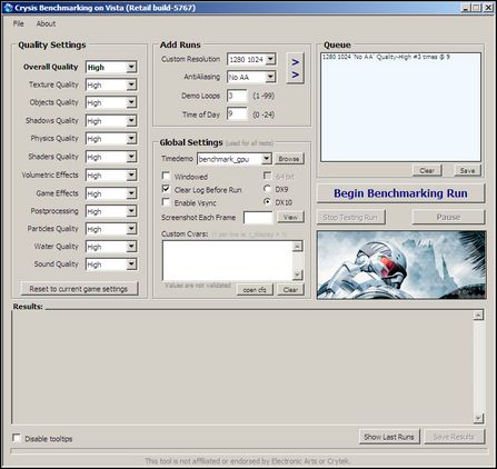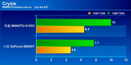 由于Crysis是目前对显卡要求最高的DX10游戏,因此在本次评测中,我们将分辨率锁定在1280*1024、1920*1080所有的画面设置都调至高,同时关闭/开启AA和AF两组测试。为了避免测试误差,我们使用了目前最新的Benchmark测试,画质全部设置为HIGH。