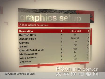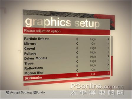 评测时,为了照顾中端的DirectX 10显卡,我们将游戏画质的为High,同时关闭全屏抗锯齿特效,打开“Wind Effects”风特效,“Mirrors”倒后镜以及“Motion Blur”动态模糊特效。