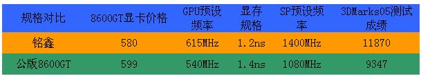 现在再回到我们今天的重点,铭鑫视界风PK版 8600GTU-256D3,不但零售价比这类公版频率的8600GT便宜了20元(580)元,而且硬件配置还大幅超越同类产品,达到了超一流水准: