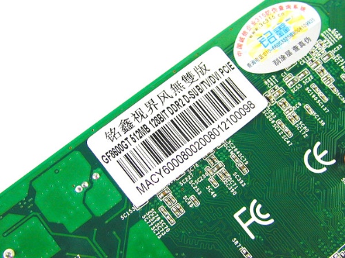 在产品背部,我们还发现了铭鑫GeForce 8600GT视界风无双版的防伪涂层及产品标识标签。从标签中能够看出这款产品的基本规格。