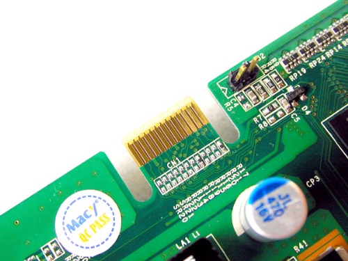 铭鑫GeForce 8600GT视界风无双版的核心供电部分,从这个角度来看,这款产品的稳定性基本还是可以保障的,1R0M是大家在显卡产品中比较常见的电感原件,目前已经得到了广泛的应用,稳定性也获得了大家的承认,电容产品也是目前比较常见的主流产品,应付日常使用还是可以的。