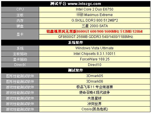 在具体的性能测试项目中,我们选择了3DMark的基准测试项目,同时又选择了5款目前比较新也比较流行的3D游戏,其中基于DirectX9技术的游戏有2款,分别为《使命召唤4》和《极品飞车11》,基于DirectX10技术的游戏有3款,分别为《失落星球》、《冲突世界》以及《Crysis》,关于这几款游戏的设置,我们将分别在各个测试项目页为大家展示当前的显卡具体设置细节。