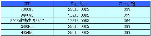 可以这么说,目前400元以下价位的显卡真的让人遗憾。先说说7300GT吧,这款DirectX 9显卡在去年年中可谓性价比之王。然而,随着各种针对新显卡优化的游戏不断问世,7300GT的性能缺陷已经非常明显。在一些较新的DirectX 9游戏中,7300GT已经全面落后于NVIDIA的8系显卡。8400GS则是另一个笑话,虽然身为独立显卡,但由于显存位宽和流处理器数量等方面的限制,这款产品的性能只能与某些板载显卡“媲美”。支持DirectX 10的特性也成为了摆设。至于最近被热炒的84GS跳线改86GT,这更是笑话中的笑话,莫非让一个男人穿全套女装摆成美女的POSE就可以说他变成女人了吗?说到底这样的所谓86GT仍然只是略为提高了频率的阉割版8400GS。