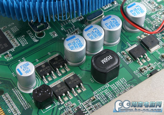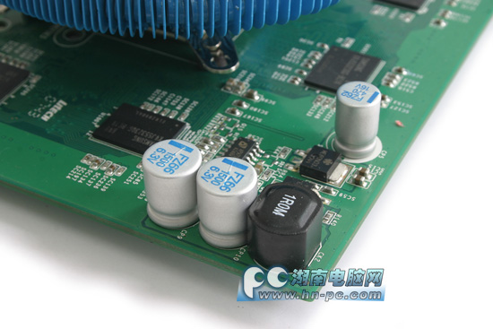 显卡的显存供电部分。铭鑫 视界风狂暴版8650GTU-512D3TC显卡采用了核心显存独立供电设计,供电部分全部采用了全封闭式电感和高品质铝壳电容,优质元件的使用不仅能够延长显卡的使用寿命,而且也是显卡稳定工作的基础。
