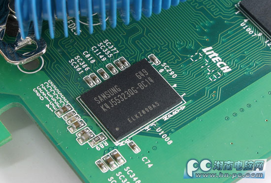 显卡采用了三星高速1.4ns的DDR3显存颗粒,共4颗组成128MB/128Bit规格,通过TC扩展技术,最大可以实现512MB的显存。显卡默认频率为核心/显存600MHz/1500Mhz,高速显存和超高的默认频率使得8500GT的3D游戏性能不再是废柴,这点我们将在接下来的评测中得到体现。