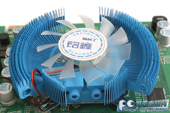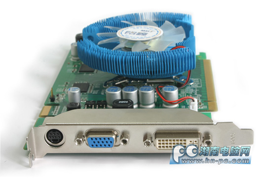 由于显卡的默认频率要高出公版8500GT显卡很多很多,因此在散热器上也使用了压固式鳍片散热,效果比传统散热更好,淡蓝色调比较少见,给人感觉不错。