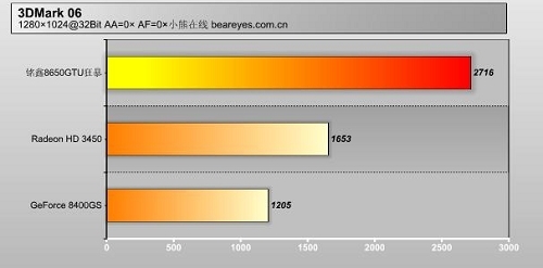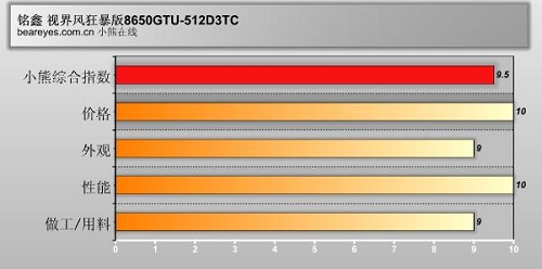 铭鑫 视界风狂暴版8650GTU-512D3TC的性能无可挑剔,在同价位的Radeon HD 3450与GeForce 8400GS的对比中全部胜出。目前在399这个价位中,由于Radeon HD 2600PRO的退市,留给我们可以选择的只有Radeon HD 3450与GeForce 8400GS,以及改版的GeForce 8400GS(核心显示为8600GT),不过这些都不足以对抗铭鑫 视界风狂暴版8650GTU-512D3TC,在399元这个价位上,铭鑫 视界风狂暴版8650GTU-512D3TC是绝对的王者,其性能甚至可以超越同价位产品的两倍,铭鑫 视界风狂暴版8650GTU-512D3TC势必傲视低端市场。