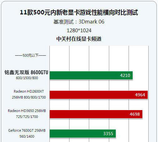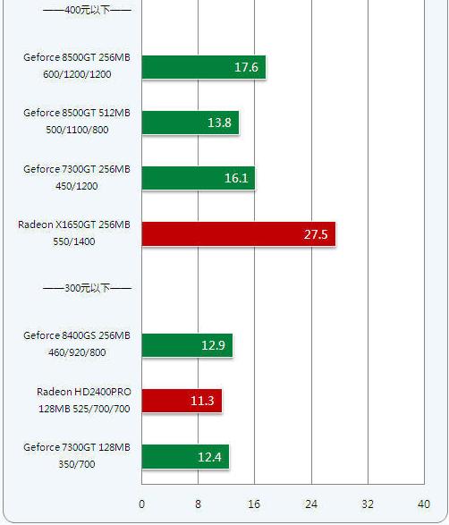 通过柱状图可以看到,同一价位段的显卡在性能上比较接近,但成绩不如基准测试3Dmark 06表现明显。显卡运行频率的高低,对显卡的游戏帧数的高低起到非常重要的影响。从游戏流畅度来看,除Radeon X1650GT以外,只有三款499元价位的DX10显卡可以达到30帧游戏基本流畅度。