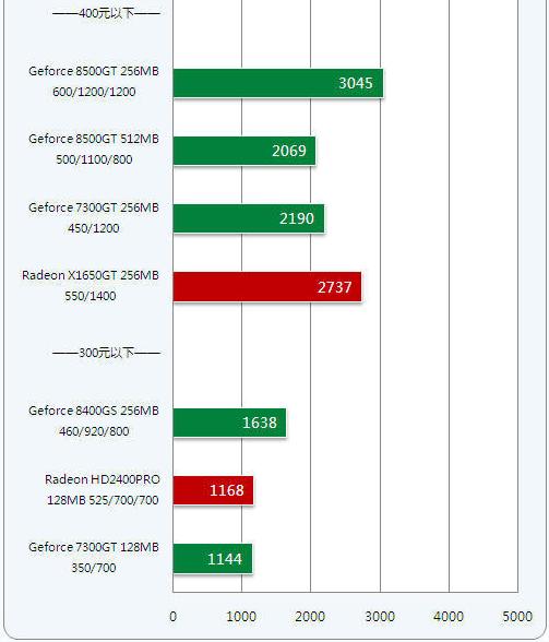 通过柱状图可以看到,499元价位的显卡性能优势明显,相比399元价位的显卡和299元价位的显卡,性能2倍和3倍的领先。显卡运行频率的高低,对显卡的游戏帧数的高低起到非常重要的影响。从游戏流畅度来看,除Radeon X1650GT以外,只有三款499元价位的DX10显卡可以达到30帧游戏基本流畅度。从游戏流畅度来看,只有499元价位的显卡和Radeon X1650GT可以流畅运行游戏。