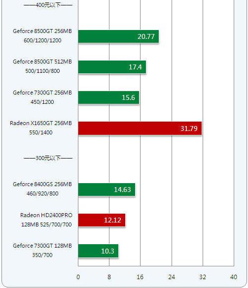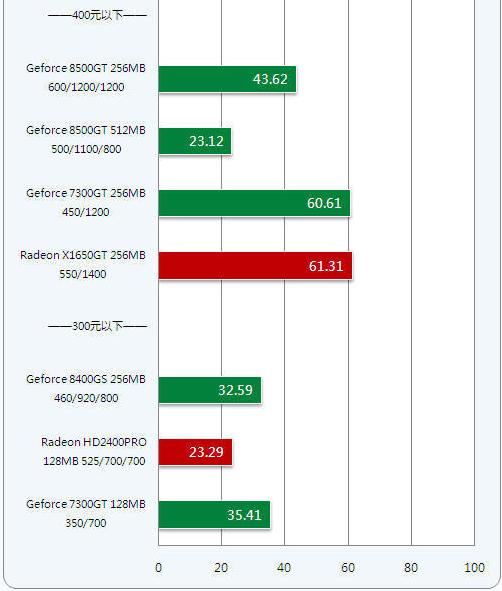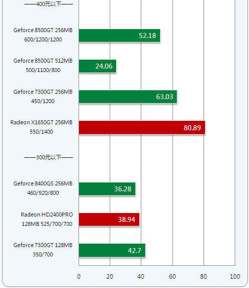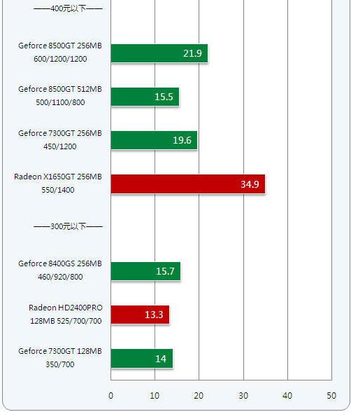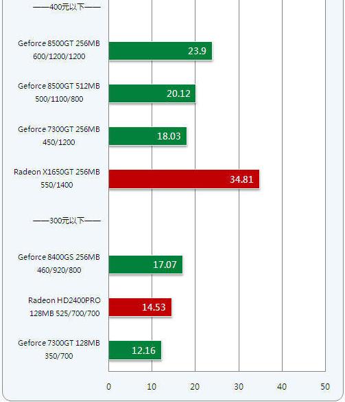 通过柱状图可以看到,同一价位段的显卡,性能基本上处于同一阶梯的。从游戏流畅度来看,299元以下的显卡也可以达到保证流畅度的30帧游戏帧数。值得注意的是,Radeon HD2400PRO在1440*900分辨率下游戏帧数较低,会影响到一定的游戏流畅度。另外,Geforce 8500GT 512MB GDDR2出现了游戏帧数异常的情况,根据笔者对这种规格显卡的了解,这应该与测试的显卡兼容性有关系,是由各品牌产品的差异化导致的。