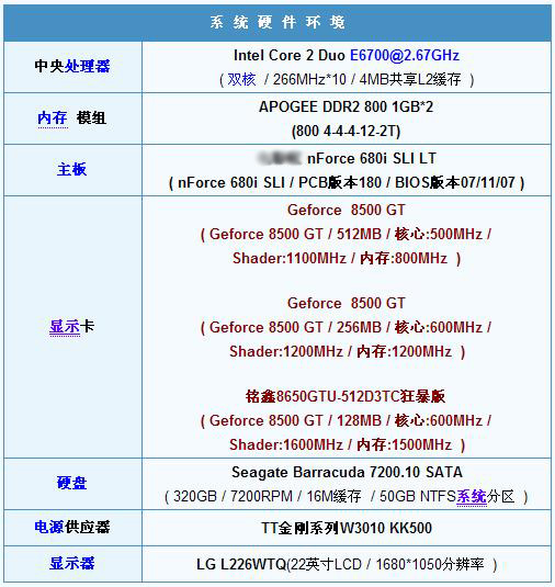 硬件平台选用了主流的Intel CoQre 2 Duo E6700@2.67GHz、 680i SLI LT和APOGEE DDR2 800 1GB*2,为了保证每相测试成绩的可对比性。其它详细配置如下: