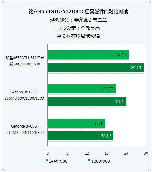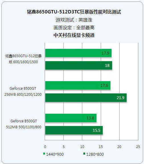 通过测试成绩我们可以看到,依靠默认频率高一直占据绝对优势的显卡——铭鑫8650GTU-512D3TC狂暴版,因为受到显存容量限制在英雄连中输给了频率低一些的8500GT 256MB GDDR3。同时8500GT 512MB GDDR2通过512MB显存容量,性能也起到了一定的提升。
