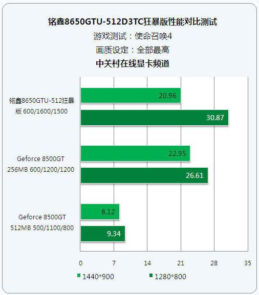 从显卡玩游戏的实用性来看,这次送测的显卡——铭鑫8650GTU-512D3TC狂暴版,具备较高的游戏性能表现,在大多数游戏测试项目中平均帧速达到了30帧要求,符合流畅运行主流游戏的条件。这样的显卡在HD2600PRO DDR3退出399元市场之后,相比低频8500GT显卡和7300GT显卡更有性能优势。