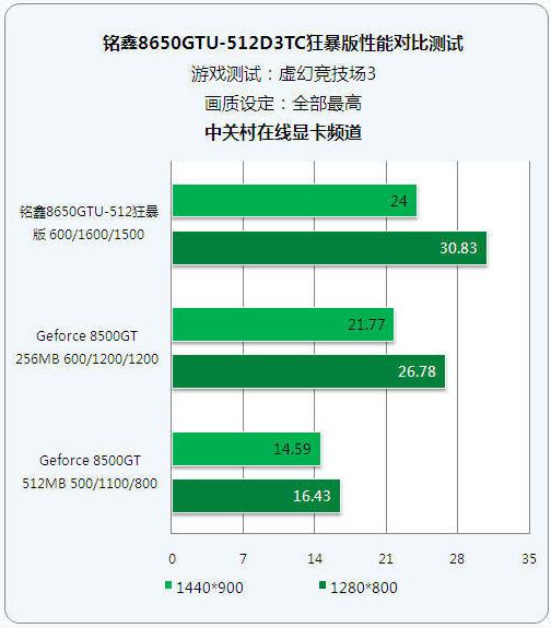 《虚幻竞技场3》采纳的虚幻3游戏引擎,测试性能具备一定的代表性。通过游戏帧数看到,默认频率高的8500GT占绝对优势,相反频率越低性能越弱,而板载大容量显存也起不到多大的实际性能提升作用。