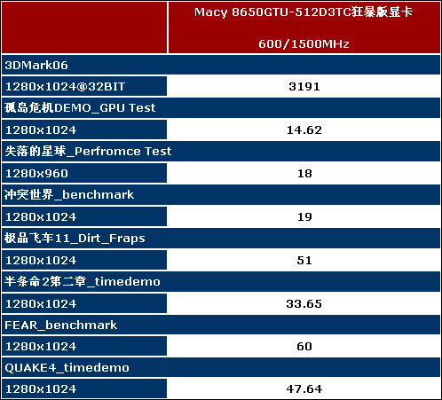由以上测试结果不难看出,板载128MB显存的Macy 8650GTU要应对高强度的crysis考验还是心有余而力不足的。而对于其余对硬件要求较低的游戏而言,基于Geforce8500GT的Macy 8650GTU还是能比较轻松应对。