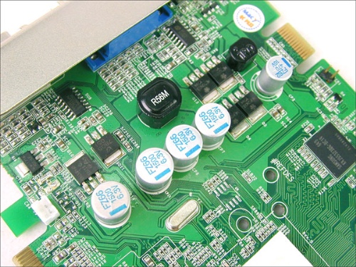 供电部分的设计还是比较值得肯定的,考虑到399元的价格,应该说铭鑫成本控制能力还是让人赞叹的。分离式供电系统在当今的显卡设计中也比较普遍,通常而言靠内侧为核心供电系统,靠外侧则是显存供电系统。虽称不上是用料奢华,但是日常使用时这套元器件的稳定性还是可以给与肯定的。最后需要大家注意的是,尽管铭鑫8650GTU-512D3TC视界风狂暴版产品上所采用的电容只是普通的电解电容,而非固态电容,考虑到其成本因素这点无可厚非,对于玩家而言同样的价格采用这样的用料能够在心理上得到一丝安慰,看上去比较养眼也算是一个额外的附加值。