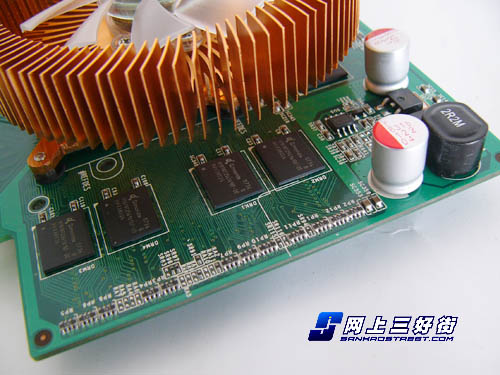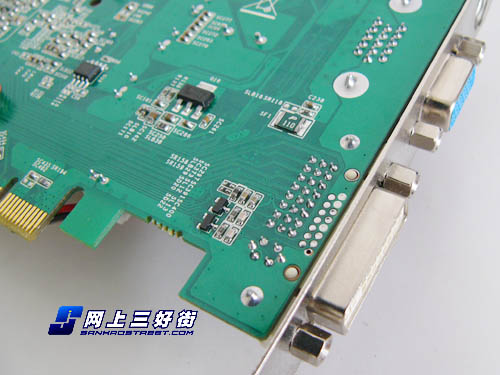 这款铭鑫视界风天下版GF8600GTU显卡采用了全固态电容设计,相比铭鑫视界风无双版8600GTU显卡的铝壳电解电容具有更好的阻抗以及更长的使用寿命,这也是铭鑫敢于为这款铭鑫视界风天下版GF8600GTU显卡提供长达三年的售后服务的原因。从电容的外观来看,应当是日本富士通生产的富士通高品质固态电容,其品质不是一般电解电容所能比拟的,因此成本也相对较高。
