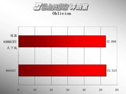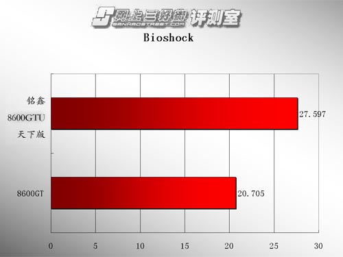 经过了OpenGL的测试,我们下面进入DirectX 9游戏测试。其中上古卷轴4是一款2006年出品的游戏,我们可以看到这款游戏虽然引入了一些像素渲染特效,但是仍然很偏重三角形的生成能力——speedtree引擎就是这方面的资源占用专家。反观2007年的游戏大作半死2:第二章与生化奇兵测试,铭鑫视界风天下版GF8600GTU显卡均以较大优势领先于公版8600GT显卡,可见在最新游戏大作中,铭鑫视界风天下版GF8600GTU显卡相比公版显卡还是非常有优势的。