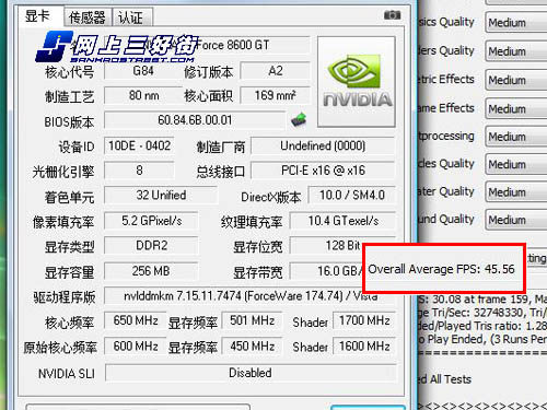 干是阐述规格不能证明什么问题,我们不妨用一款公版8600GT显卡作为参照,看看这款铭鑫视界风天下版GF8600GTU显卡在降价后是否性能方面有所不同:
