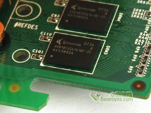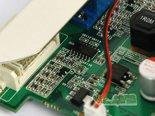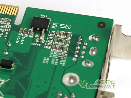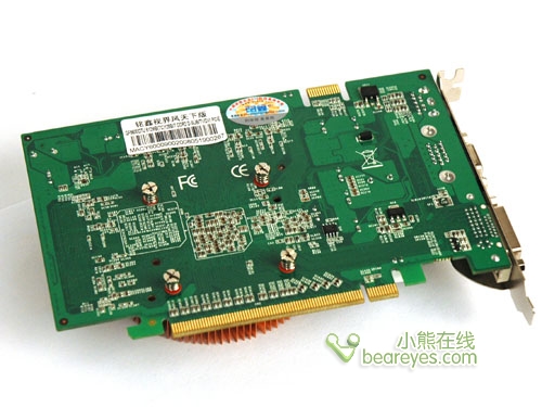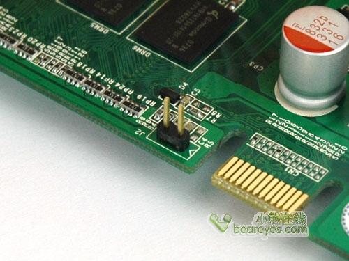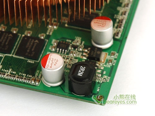 显卡提供了一组FPDIF音频输入进口,这样我们就可以通过DVI转HDMI接口同时输出画面和音效了;同时在显卡PCB的边缘铭鑫还安排了众多的排阻,更有利于信号的屏蔽。