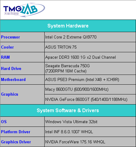 为了能更全面、清楚的了解铭鑫8600GTU各方面的性能表现,测试软件方面我们选择了3DMark06、3DMark Vantage综合类测试软件来测试其综合性能;选择Company of Heroes和World In Conflict来测试其在最新DX10游戏中的性能表现。3D性能测试中采用1024x768、1280x1024和1680x1050三种分辨率,同时我们加入公版GeForce 8600GT的测试成绩进行对比。