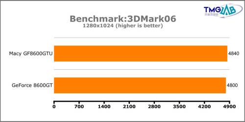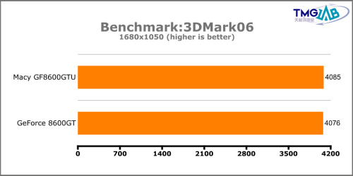 在3DMark06的测试中,铭鑫8600GTU凭借着其较高的核心/Shader频率,不仅弥补了其显存频率相对较低的不足,并且使得其在三种分辨率下的性能表现均要优于公版8600GT