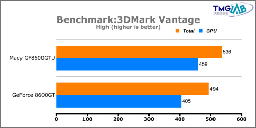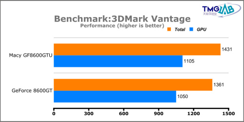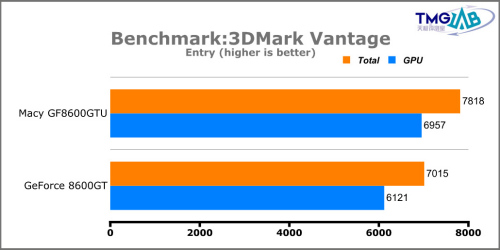 在3DMark Vantage的测试中,与在3DMark06中相类似,铭鑫8600GTU凭借着其较高的核心/Shader频率,不仅弥补了其显存频率相对较低的不足,并且使得其在三种分辨率下的性能表现均要优于公版8600GT,并且领先幅度要比在3DMark06中来的大。