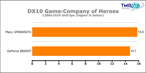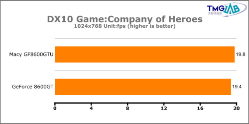 在Company of Heroes的游戏测试中,铭鑫8600GTU仍然取得了相对公版8600GT的性能优势,并且随着分辨率的提升,领先优势进一步扩大。