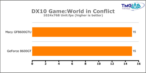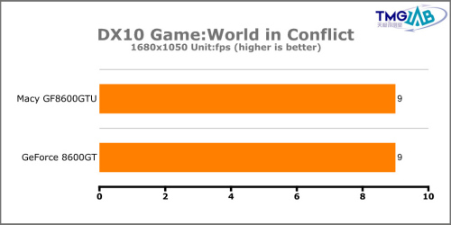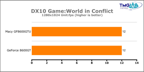 在World In Conflict的游戏测试中,由于World In Conflict的测试成绩不够精确,因此在三种分辨率下铭鑫8600GTU的测试成绩与公版8600GT旗鼓相当。