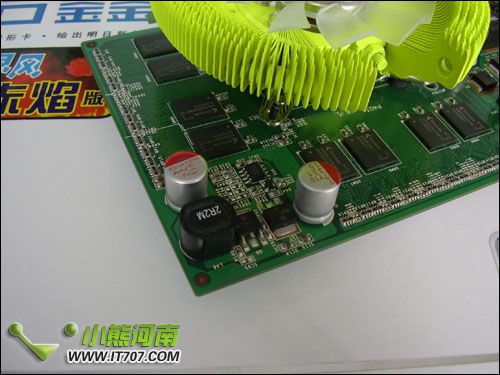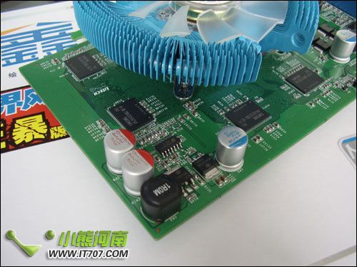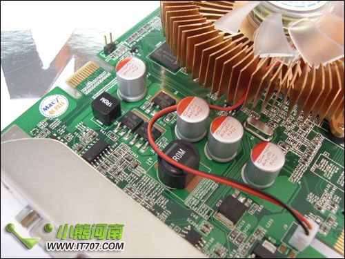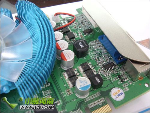 供电方面,显卡采用了核心、显存独立的供电设计,并且采用了全固态富士通电容配合全封闭式电感,用料相当豪华,保证了显卡的电流需求。散热方面,显卡采用了铜质散热片,配合大直径滚珠风扇,保证了显卡在长时间运行时的散热需求,同时从散热片风道吹出的风还能辅助显卡显存以及供电模块的散热。
