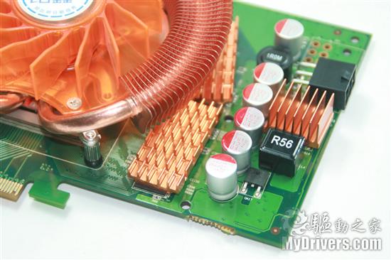 从上面能够看出,在各项参数保证了毫无缩水的同时加入了更多的亮点,首先就是针对8800GT的散热差的问题加入的热管纯铜散热器,然后就是供电上采用了3+2而非3+1相的供电方式,保证了超频性能的同时加强了日常的稳定性。搭配了1.0ns 512M DDR3显存与高性能固态电容的同时实现出色的超频能力。