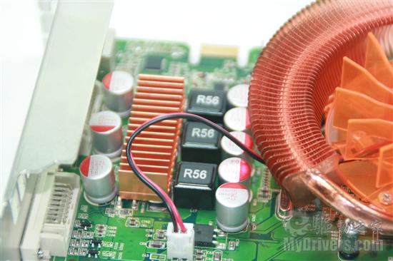 从图上能够看到显存上覆盖了铝制散热片,一定程度上保证了显卡大负荷运行时显存的散热。显存使用了三星1.0ns DDR3显存颗粒,正面8颗组成512MB/256bit的显存规格,理论上该显存还可以有更进一步的提升。
