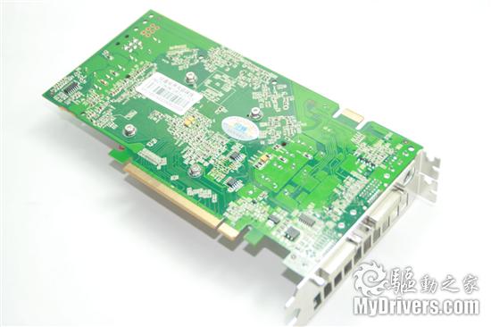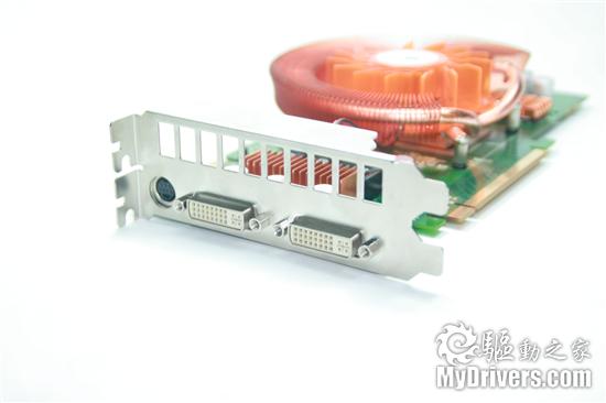 接口部分采用双DVI+S-Video输出接口,双挡板宽度设计保证了风扇的散热效果,背部挡板上方突出的部分为电磁屏蔽挡板。