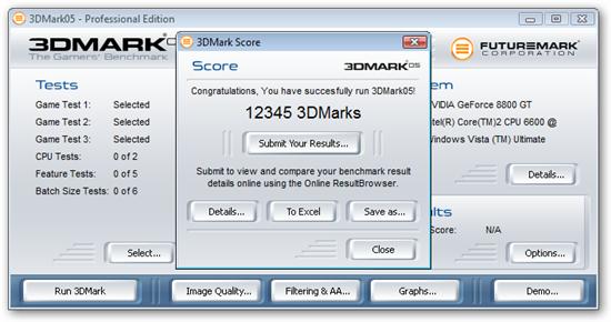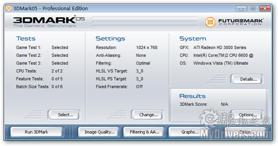 《3DMARK05》:包含了三个测试场景,都是完全基于DX9架构的,并且它提供了对微软DirectX 9.0C的支持,完全支持Shader Model 2a、2b。3DMARK05还使用了全新的更为类似游戏的3D引擎,使测试更接近于正常的游戏运行,而且它对系统的性能有很高的要求。