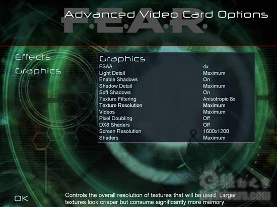 游戏画质:Maximum画质,由于游戏最大分辨率为1600X1200,测试画质的选择为1024X768、1280X960、1600X1200。