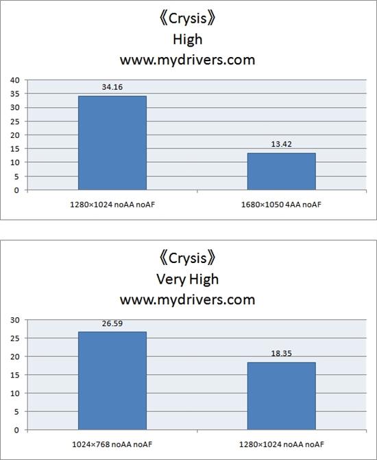 在《Crysis》的测试中我们测试了两种不同的画质,一种是High画质,另一种是Very High画质。最高的Very High画质对系统与显卡的要求十分之高,但是从成绩上我们可以看到最高画质下《Crysis》已经拥有了高于25fps的可玩性。