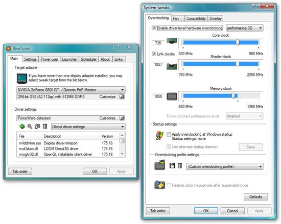 超频软件使用RivaTuner,经过反复测试,最终频率稳定在734/1837/2100MHz完成了全部测试项目,核心与显存频率分别提升到了134/300MHz,核心与显存频率轻而一举达到了22%/17%,这还是我们进行的简单超频后的结果,相信在玩家手中它能发挥更佳的能力。