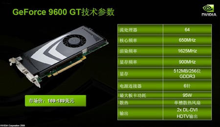 9600GT是NVIDIA首次将256bit显存位宽导入到中端显卡的GPU,翻倍的显存位宽意味着可以提供更高的数据读写带宽。因此9600GT尽管只是中端显卡,但实际性能却达到以往高端显卡的水准。自上市以来,9600GT经过几个月以来的价格调整,目前国内市场上的Geforce 9600GT显卡降到了699元~899元的价位区间。