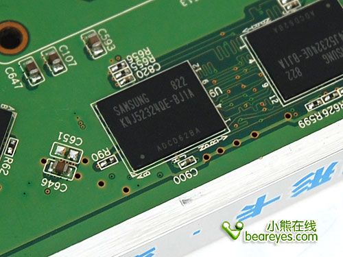 显存采用了三星GDDR3 1.0ns颗粒,编号为K4L52324DE-BJ1A,PCB正面8颗显存,组成512M/256bit规格。