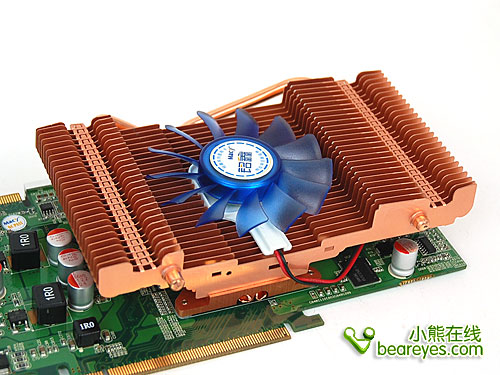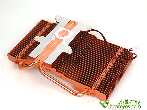 巨型的红铜色散热器外形非常夸张,覆盖到PCB大部分,散热片高度的需要占用两个PCI-E槽位,中间是一个7CM左右的风扇,两pin的供电接口不带智能温控功能,这是大部分非公版产品的通用设计。