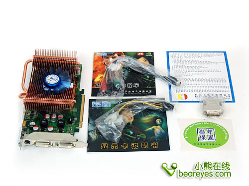附件方面包括基本的产品说明书、驱动光盘、售后质保卡、三年保固标签,以及大4pin转6pin的电源线、DVI-VGA转接头和一个HDTV的视频色差输出线。
