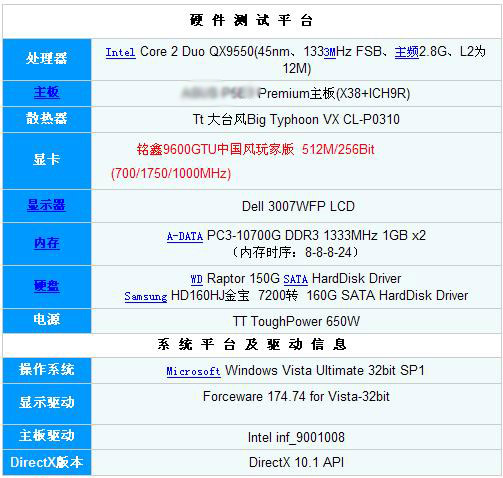 操作系统选择上,我们使用了Windows Vista-32bit Ultimate SP1。游戏方面,我们选择了几款主流游戏大作,包括《使命召唤4:现代战争》、《虚幻竞技场3》、《英雄连:抵抗前线》、《冲突世界》、《孤岛危机》。