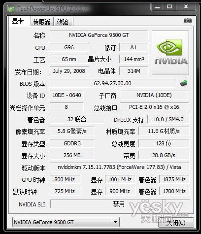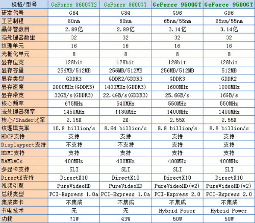 9500GT采用了G96核心,规格同8600GT所采用的G84十分相似,不过得益于制程的提高,9500GT在核心/Shader/显存上的频率相比8600GT都有一定提高。在配搭的灵活性上,9500GT可以支持GDDR2和GDDR3显存,使得产品更能适应低端市场的需求。