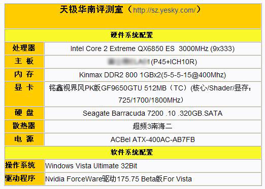 为了测试成绩更加准确,避免平台出现瓶颈,我们使用了性能异常强悍的四核Intel Core 2 Extreme QX6850 ES版,采用65nm制造工艺,核心代号为Kentsfield,FSB时钟频率1333MHz(333MHz×4),倍率设定为9倍,核心频率3GHz ,二级高速缓存达到8MB。测试项目方面,基础显示性能方面我们选取了主流的3DMark 06测试软件,为测试超频后的性能差异,我们将继续选用3DMark 06来作对比;而在实际游戏性能测试中,我们选取了失落星球、西部狂野等经典游戏进行测试。