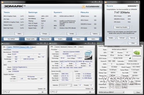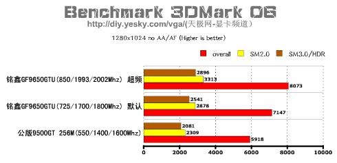 从上面的分数来看,由于公版9500GT的默认频率与铭鑫视界风PK版GF9650GTU 512MB(TC)显卡的频率相差巨大,所以在成绩上有着巨大差异也是无可厚非的。另外,得益于新制程额优势,核心轻松超频至850MHz;当核心超频至850MHz,显存我们也小超至2002MHz,此时的3D Mark06的分数已经突破的8000分,达到了8073分!同比公版9500GT要高出2000分之多,性能提升达36.4%!这个幅度的性能提升在游戏方面的表现尤为明显。